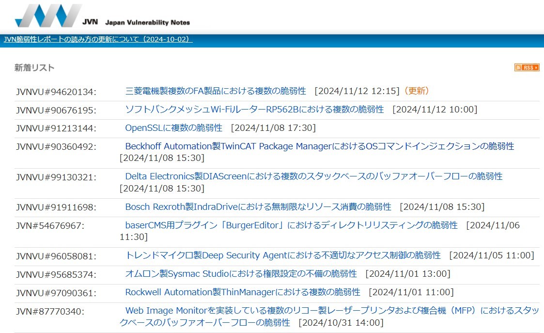 新しい脆弱性を伝えるJVNの新着リスト