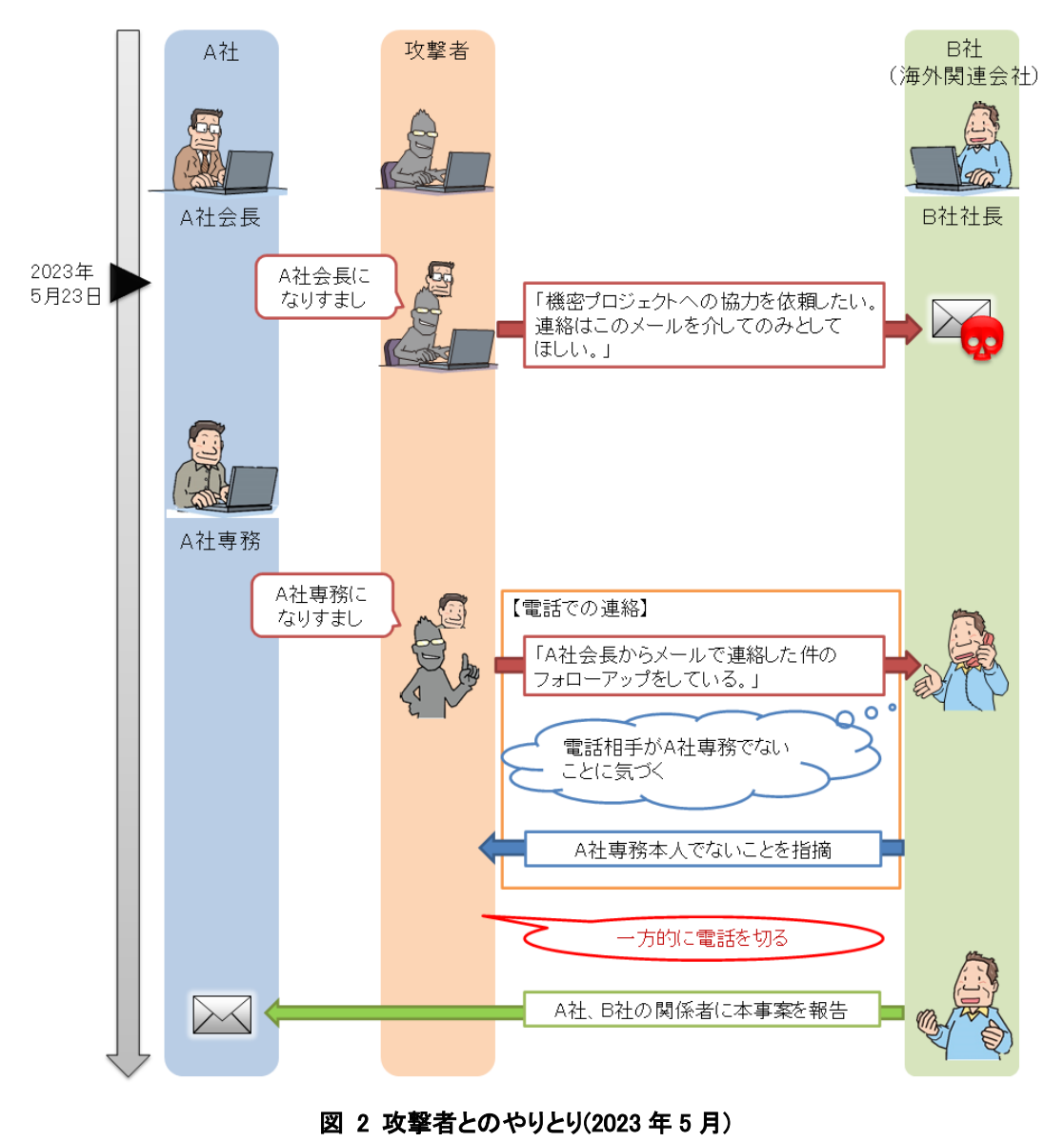 国内企業A社の会長に成りすました攻撃者が、関連企業B社の社長に機密プロジェクトへの協力をメールで依頼。続いてA社の専務を騙ってB社長に電話をかけましたが、社長は専務ではないことに気付きそれを指摘すると、電話は一方的に切断。B社長が疑問を持った理由は、情報提供の範囲外としてIPAは詳細不明としていますが、これがなければ騙されていたかもしれません。